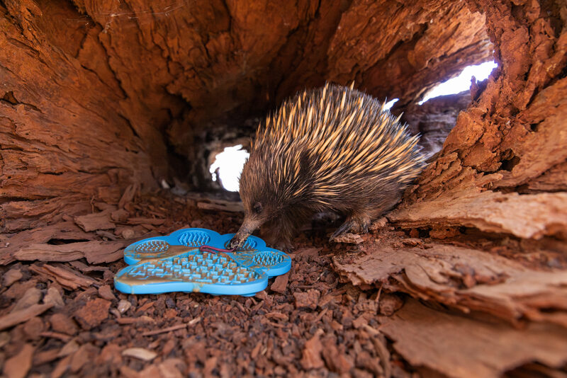 FUN WITH FOOD… Kyabram Fauna Park’s short-beaked echidnas’ tongues are being put to the test with puzzle feeders. Photo: Supplied