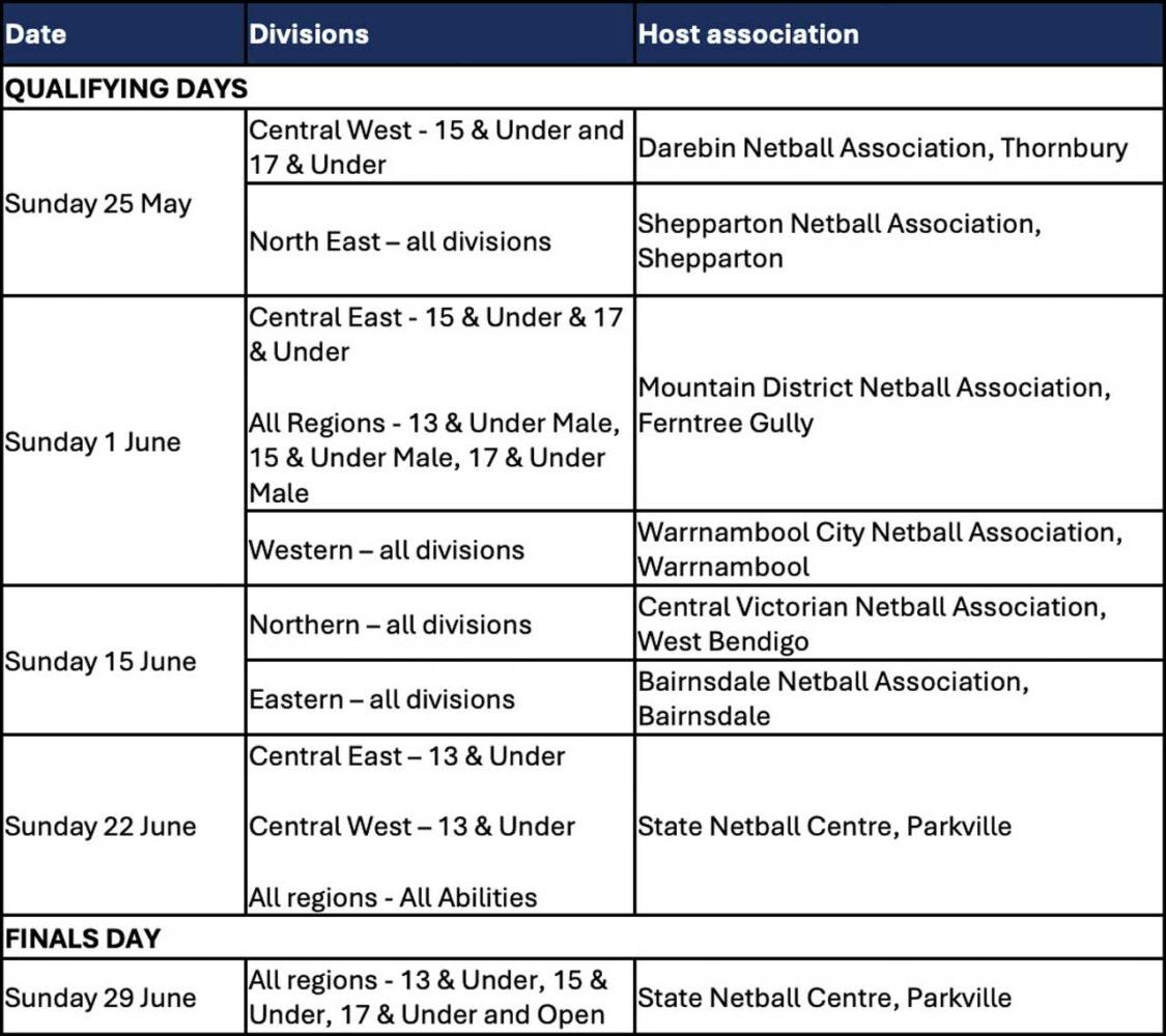 Megan Simpson, Netball Victoria general manager (high performance and pathways), said, “The strength of the Victorian netball pathway begins at Association Championships where the best netball talent in those regions is on show.
