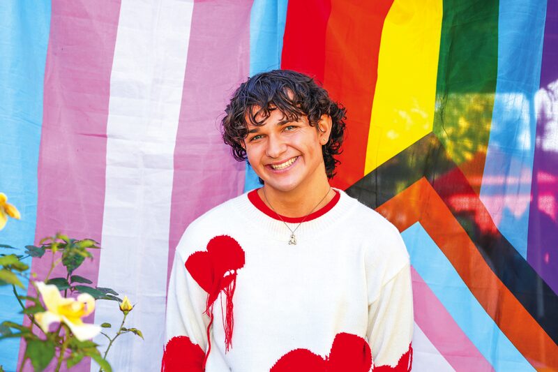 CHAMPIONING QUEER VOICES… Local Tom Nethersole is the embodiment of positivity, participating in a myriad of local events such as Out in the Open, and IDAHOBIT Day. Pictured is Tom against the Transgender Flag and the Progress Pride Flag. Photo: Brittany Drysdale