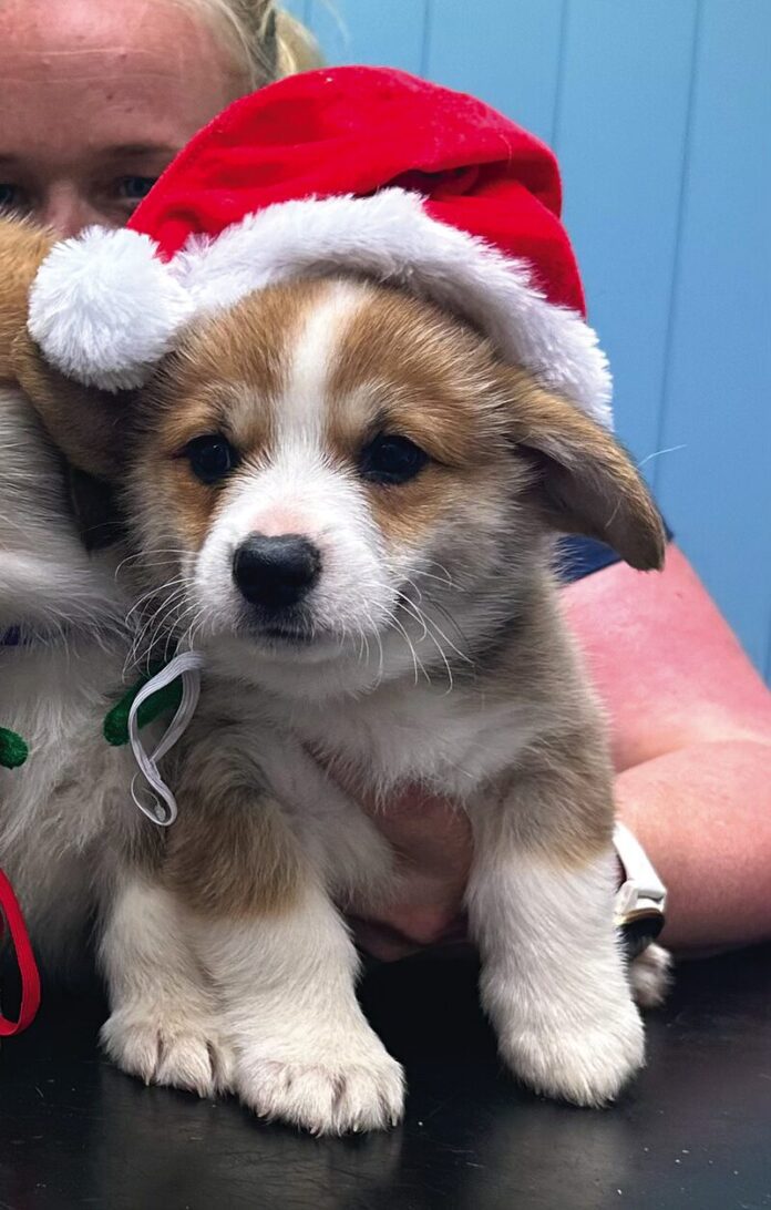 OUR winner of the five WB Hunters dog wash vouchers by a close vote is Kathy McPherson, with one of her Corgi pups, all ready for Christmas